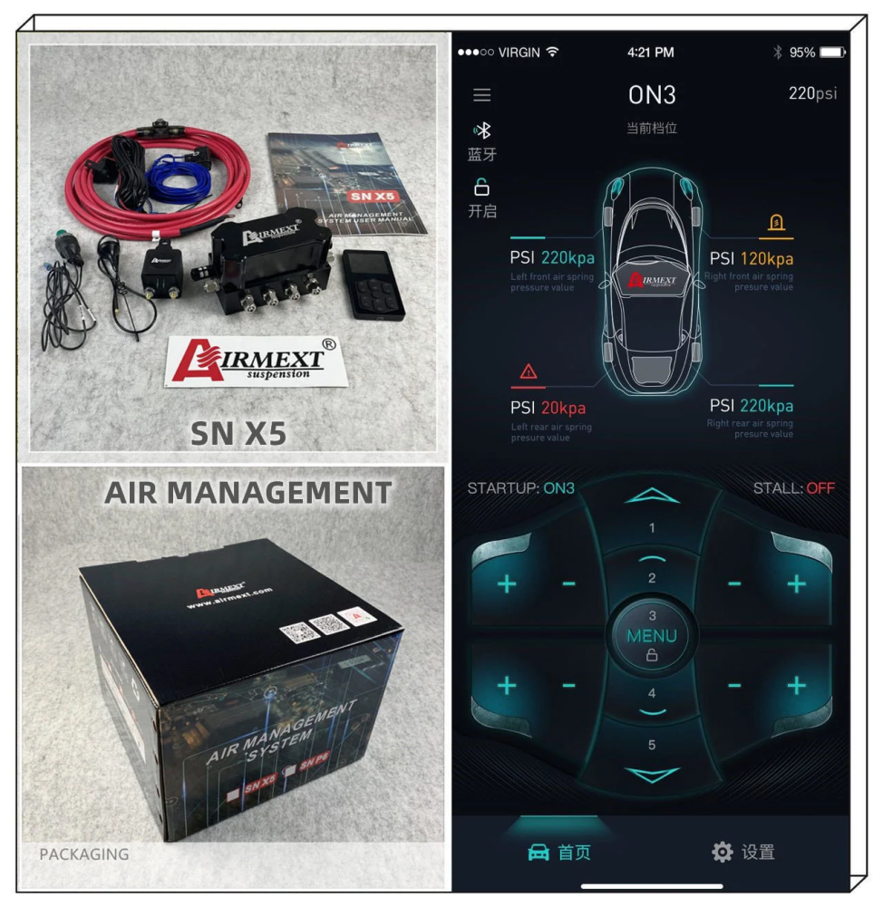 ---Electronically controlled air suspension system, also known as the control unit is the core part of the air suspension system and electric control system has the versatility, can be applied to all models, electronic control system for the button panel , AG and wireless remote control lift, have both before and after lifting function, supporting AG ECU to control computer, key-press panel and ECU, the ECU and solenoid valve only need a cable to plug connection between line, wiring simple, ISO9001:2008 certificate on all our products.