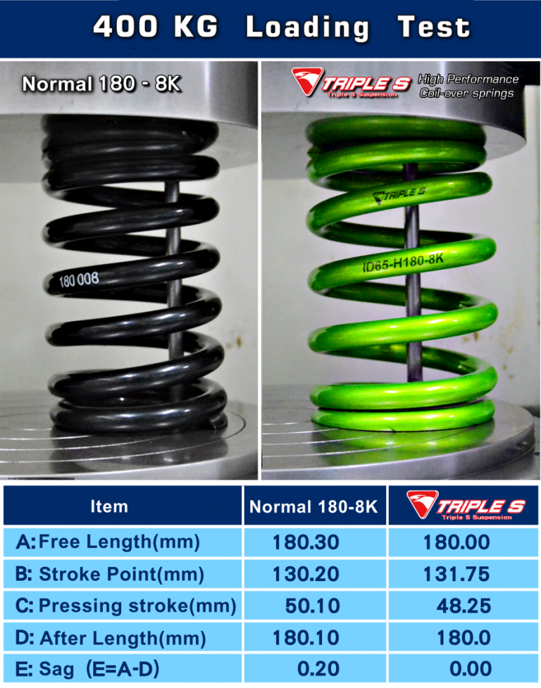 Triple S Coilover springs are made of TS2000 (with a tensile strength of 2000 MPA), as apposed to a traditional coilover spring which is usually SAE9254 (1800 MPA). This specially developed material allows us to manufacture springs in a unique method which yields a product with more usable stroke that is both lighter in weight, and offers increased ride quality and durability than almost any other coilover spring on the market.
